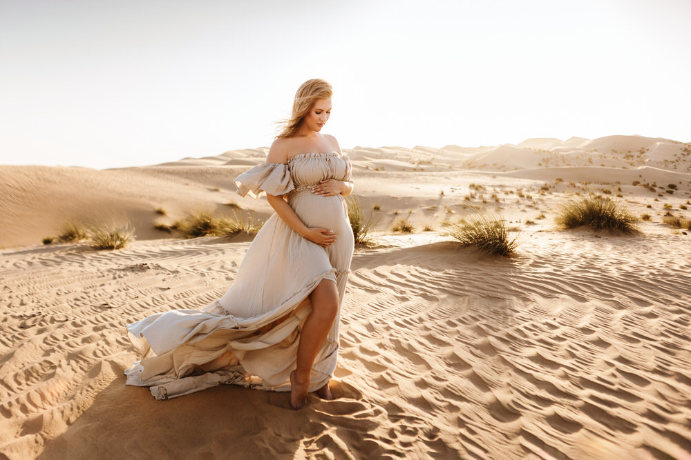 The desert dunes of Abu Dhabi, tranquil beaches, desert dunes, and soft, calming sunsets create the most beautiful scene. Outdoor maternity photography can add movement, warmth, and nature to the photo session.